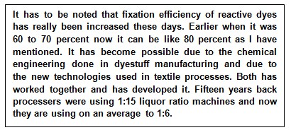 But it has to be noted that fixation efficiency of reactive dyes has really been increased these days. Earlier when it was 60 to 70 percent now it can be like 80 percent as I have mentioned. It has become possible due to the chemical engineering done in dyestuff manufacturing and due to the new technologies used in textile processes. Both has worked together and has developed it. Fifteen years back processers were using 1:15 liquor ratio machines and now they are using on an average to 1:6. And in case of dyes, earlier we were using cold brand dyes where fixation was only 55 to 60 percent in medium and deep shades, vinyl sulphun dyes where fixation was not more than 65 percent. And then we were using bi-functional and poly functional dyes, their fixation was definitely more than 70 to 75 percent. So, it is an improvement. These poly-functional dyes work in medium temperature at 40 to 60 degree Celsius, so the energy requirements also have come down.